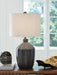 Details Made of polyresin with drum hardback fabric shade, Black finish, 3-way switch, 1 E26 socket, type A bulb recommended (not included); 100 watts max or LED equivalent; UL Listed, Minor assembly required; simply attached preassembled shade to lamp base