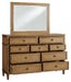 | Details | B895B2: Includes upholstered panel headboard, footboard, rails and slats, Made with hardwood solids, hickory veneer and MDF substrates, Light brown wood-tone finish, Polyester upholstery, Foundation/box spring required, sold separately, Mattress available, sold separately, Assembly required, B895B1: Includes dresser and mirror, Made with hardwood solids, hickory wood veneer and MDF substrates, Light brown wood-tone finish, Dark bronze-tone drawer pulls, 9 drawers with fully finished interior, dovetail construction and heavy duty ball-bearing side glides (top drawers felt lined), Mirror attaches to back of dresser, | |