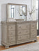 | Details | Includes dresser and mirror, Made with hardwood solids, birch veneer and MDF substrate, Light gray finish enhances the natural wood grain, Ring pull hardware, 9 drawers with fully finished interiors, dovetail construction and ball-bearing side glides, Jewelry drawer conveniently located in the center valance, Mirror attaches to back of dresser | |