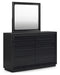 Details B768B2: Includes headboard, footboard and rails, Made with pine solids, veneers and engineered wood substrate, Textured black wood stain with waxy topcoat, Extra wide rails for a bench-like wrap around, Foundation/box spring required, sold separately, Mattress available, sold separately, Assembly required, B768B1: Includes dresser and mirror, Made with pine solids, veneers and engineered wood substrate, Textured black wood stain with waxy topcoat, Hardware-less design, 6 drawers with fully finished interiors, dovetail construction and ball-bearing side glides (top drawers felt lined), Mirror attaches to back of dresser,