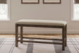 This counter height upholstered bench might be simple at first sight, but a closer look reveals beauty in the details. With a distressed nutmeg finish, antiqued nailhead trim and textured polyester upholstery, it's beaming with charm. Cushioned seat ensures long, lingering meals are enjoyed in total comfort.