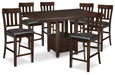 Details D596-42: Made of veneers, wood and engineered wood, Separate extension leaf, Table extends by pulling both ends and dropping in leaf, Seats up to 6, Assembly required, Bar stools available, sold separately, D596-124: Made of veneers, wood and engineered wood, Vinyl upholstery, Cushioned seat, Slat back design,