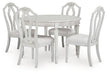 | Details | D795-35: Made with hardwood solids, acacia wood veneer, MDF substrate and cast resin components, Antiqued white finish, Tabletop with butterfly-matched veneer pattern, Removable center leaf, Table extends by pulling both ends and dropping in leaf, Seats up to 6, Dining chairs sold separately, Assembly required, D795-01: Made with solid wood frame and cast resin components, Antiqued white finish, Polyester upholstery, Foam cushioned seat, Includes adjustable levelers, Assembly required, | |
