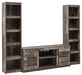 Make this entertainment center the center of attention with its popular urban eclectic style. Its rustic finish over a replicated pine grain creates an authentic natural look for your home entertainment area. You'll love its functionality. Two tall piers with open shelving allow you to put home accents on display, safely out of the way, while the TV stand’s two spacious cabinets with shelved storage easily accommodate media needs.