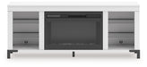 Details Made with engineered wood (MDF/particleboard/plywood) and decorative laminate for the right balance of affordability and durability, Matte white finish with subtle replicated wood grain, Decorative laminate replicates natural or man-made material surfaces with consistent color, pattern and texture, Legs with black finish, 4 glass shelves, Fireplace insert and shelves feature color and brightness controlled LED lighting, 3 color settings for synchronized LED lights: blue, red and white, Remote control with LED display, Power cord included; UL Listed, Minor assembly required