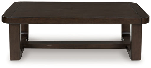 If casual contemporary style is your thing, then you'll love this coffee table. Its thick tabletop, softly rounded corners and dark wood-tone finis...