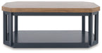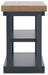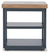 | Details | Includes coffee table and 2 end tables, Made with hardwood solids, mindi veneer and MDF substrate, Tabletop with light brown wood-tone finish, Base with dark blue slate finish, Coffee table includes casters for easy mobility, End tables have 2 open shelves, Assembly required | |