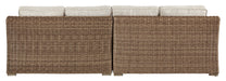 Details Includes left-arm facing loveseat, right-arm facing loveseat and 4 throw pillows, "Left-arm" and "right-arm" describe the position of the arm when you face the piece, For indoor or outdoor use, All-weather resin wicker handwoven over powder coated rust-proof aluminum frames, Cushions and pillows covered in high-performing Nuvella™ fabric, All-weather foam cushion core wrapped in soft polyester, Clean fabric with mild soap and water, let air dry; for stubborn stains, use a solution of 4 oz. bleach to 28 oz. water, Imported fabric and fill, Assembly required