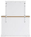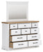 Details B844B5: Includes panel headboard, storage footboard, rails and roll slats, Footboard made with hardwood solids, MDF substrates and butcher block oak veneer, Headboard and rails made with hardwood solids and MDF substrates, White finish, Headboard with inset black metal barn sash, 2 drawers in footboard with fully finished interior, dovetail construction and ball-bearing side glides, Pulls with matte black finish, Bed does not require a foundation/box spring, Mattress available, sold separately, Assembly required, B844B1: Includes dresser and mirror, Made with hardwood solids, MDF substrates and butcher block oak veneer, Dresser with 2-tone finish (white finish; butcher block oak veneer with natural finish), Pulls with matte black finish, 10 spacious drawers with fully finished interiors (top drawers felt lined), dovetail construction and ball-bearing side glides , Drawers with inset picture fronts, Mirror attaches to back of dresser,