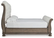 | Details | B944B5: Includes upholstered sleigh headboard, upholstered sleigh footboard, sleigh rails and slats, Made with solid wood frames, solid wood blocking and foam, Light brown finish with glazed antiqued look , Polyester upholstery, Nailhead trim with aged bronze-tone finish, Foundation/box spring required, sold separately, Mattress available, sold separately, Assembly required, B944B1: Includes dresser and mirror, Made with hardwood solids, oak and ash veneer, MDF substrates and cast resin components , Top with inlaid ash veneer border, Light brown finish with glazed antiqued look , Metal hardware with aged bronze-tone finish , 9 drawers with fully finished interior, dovetail construction and heavy duty ball-bearing side glides, Mirror attaches to back of dresser, | |