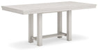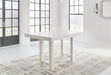 Details D642-32: Made with rubberwood solids, ash veneer and MDF substrates, Antiqued white finish with wood grain texture, Tabletop with planked effect, Two 12” extension leaves, Table extends by pulling both ends and dropping in leaf, Assembly required, D642-124: Made with wood, Antiqued white finish with wood grain texture, Foam cushion with polyester upholstery, Nailhead trim, X-back, Assembly required,