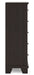 | Details | Made with hardwood solids, engineered wood veneer and MDF substrates, Dark brown finish, Metal bar pulls with bright nickel-tone finish, 5 smooth-gliding drawers with dovetail construction and metal center guides, Drawer interiors are lined with a wood grain laminate for a clean, finished look, Top moulding | |