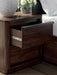 Casual contemporary styling with a decidedly modern vibe. This nightstand is warm and inviting with a rich dark brown finish, adorning your restful retreat with on-trend elegance. Full-length metal pulls in a matte black finish add a subtly cool touch to spacious bedside storage drawers. What a simply stunning way to achieve the bedroom of your dreams.