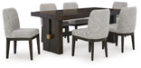 Dressed to thrill, this simply stunning dining package offers a high-design look at a down-to-earth price. Ultra sleek lines are accentuated with a dark waxy brown oak-tone finish that’s so easy on the eyes. A clean-lined, modern dining table showcases quality craftsmanship with its double pedestal base and thick edge tabletop. The armless dining chairs, upholstered in a tweed-like neutral fabric, are designed with a softly contoured back design that's tailor-made for comfort. Whether you're hosting family meals or holiday entertaining, this set has a timeless look that’s made to last.