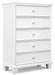 | Details | Made with hardwood solids and MDF substrate, White painted finish, Round metal drawer knobs with satin nickel-tone finish, Tapered feet, Framed drawer fronts, 5 smooth-gliding drawers with dovetail construction and ball-bearing side glides | |