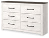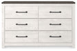Details Made of engineered wood (MDF/particleboard), and decorative laminate, White rustic finish with replicated cedar grain, Rustic gray planked replicated oak grain with authentic touch, 6 smooth-gliding drawers with faux linen lining, Large scale dark colored handles, Safety is a top priority, clothing storage units are designed to meet the most current standard for stability, ASTM F 2057 (ASTM International), Drawers extend out to accommodate maximum access to drawer interior while maintaining safety, Assembly required