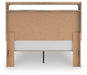 The natural wood tones and clean lines of this queen upholstered platform bed echo your easygoing style sensibilities. With a warm finish and replicated oak grain, its carefree character lightens up your bedroom. Curved inner corner details soften the look, while contrasting brown fabric modernizes the feel. And for added function, warm LED lighting adds serene ambiance at the touch of a button.