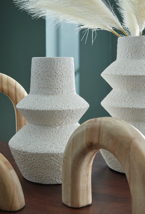 Craft a contemporary haven with the delightfully neutral tones and modern forms of this accessory set. Its sculptures, with their seamlessly streamlined arch designs, can be displayed together or stand solo as subtle statement pieces. The tiered look of the eye-catching vases adds that much more geometric interest.
