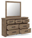 This dresser with mirror delivers a fresh, trend-right spin on rustic design. Its natural wood tones, minimal lines and dimensional detailing create a look that’s effortlessly chic yet grounded in authenticity. Complete with a thick, weighty top and silhouette, this set has a substantial style that feels timeless.