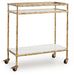 | Details | Made with sand casted aluminum, Antiqued brass-tone finish, White marble lower shelf, Clear glass top shelf, Casters for mobility, Color variations, fissures, mineral deposits and veining in the marble shelf are naturally formed characteristics, Assembly required | |