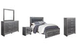 Details B214-46: Made of engineered wood (MDF/particleboard) and decorative laminate, Gray finish with replicated wood grain, Faceted chrome-tone pulls and accents, 5 smooth-operating drawers, Drawer interiors are lined with a faux linen laminate for a clean, finished look, Safety is a top priority, clothing storage units are designed to meet the most current standard for stability, ASTM F 2057 (ASTM International), Drawers extend out to accommodate maximum access to drawer interior while maintaining safety, B214-92: Made of engineered wood (MDF/particleboard) and decorative laminate, Gray finish with replicated wood grain, Faceted chrome-tone pulls and accents, 2 smooth-operating drawers, Drawer interiors are lined with a faux linen laminate for a clean, finished look, USB and wireless charging options, Power cord included; UL Listed, Assembly required, B214B1: Made of engineered wood (MDF/particleboard) and decorative laminate, Gray finish with replicated wood grain, Faceted chrome-tone pulls and accents, 6 smooth-operating drawers, Drawers lined with faux linen laminate, Mirror attaches to back of dresser, Includes tipover restraint device, Assembly required, B214B3: Includes headboard, footboard and side rails, Made of engineered wood (MDF/particleboard) and decorative laminate, Gray finish with replicated wood grain, Faux leather upholstery, Faux crystal and faceted chrome-tone metal accents, Accent LED lights with remote to control color and brightness, 2 smooth operating drawers, Power cord included; UL Listed, Small Space Solution, Foundation/box spring required, sold separately, Mattress available, sold separately, Assembly required, Bed is not compatible with an adjustable base,