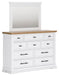 | Details | B844B2: Includes panel headboard, storage footboard, rails and roll slats, Footboard made with hardwood solids, MDF substrates and butcher block oak veneer, Headboard and rails made with hardwood solids and MDF substrates, White finish, Headboard with inset black metal barn sash, 2 drawers in footboard with fully finished interior, dovetail construction and ball-bearing side glides, Pulls with matte black finish, Bed does not require a foundation/box spring, Mattress available, sold separately, Assembly required, B844B1: Includes dresser and mirror, Made with hardwood solids, MDF substrates and butcher block oak veneer, Dresser with 2-tone finish (white finish; butcher block oak veneer with natural finish), Pulls with matte black finish, 10 spacious drawers with fully finished interiors (top drawers felt lined), dovetail construction and ball-bearing side glides , Drawers with inset picture fronts, Mirror attaches to back of dresser, | |