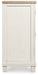 Details Made with hardwood solids, veneers and MDF substrates, Two-tone finish (antiqued white and light gray wood tone), Dark rustic bar pulls, 2 glass-front cabinets, each with adjustable shelf, Door includes interchangeable wood veneer panel (ships with glass panel installed), 5 drawers with fully finished interior, dovetail construction and heavy duty ball-bearing side glides (top drawer felt lined)